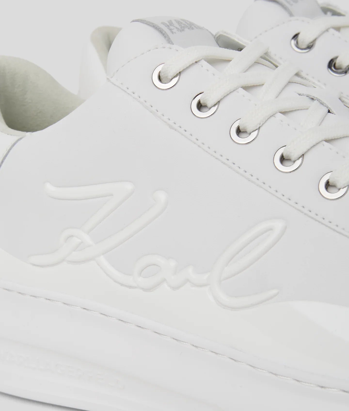 Elevate everyday style with these classic leather sneakers. The sleek lace-up design features a tonal heel counter adorned with the KARL LAGERFELD logo. Glossy KARL Signature artwork adds a touch of personality, ensuring a standout look for any casual outing.