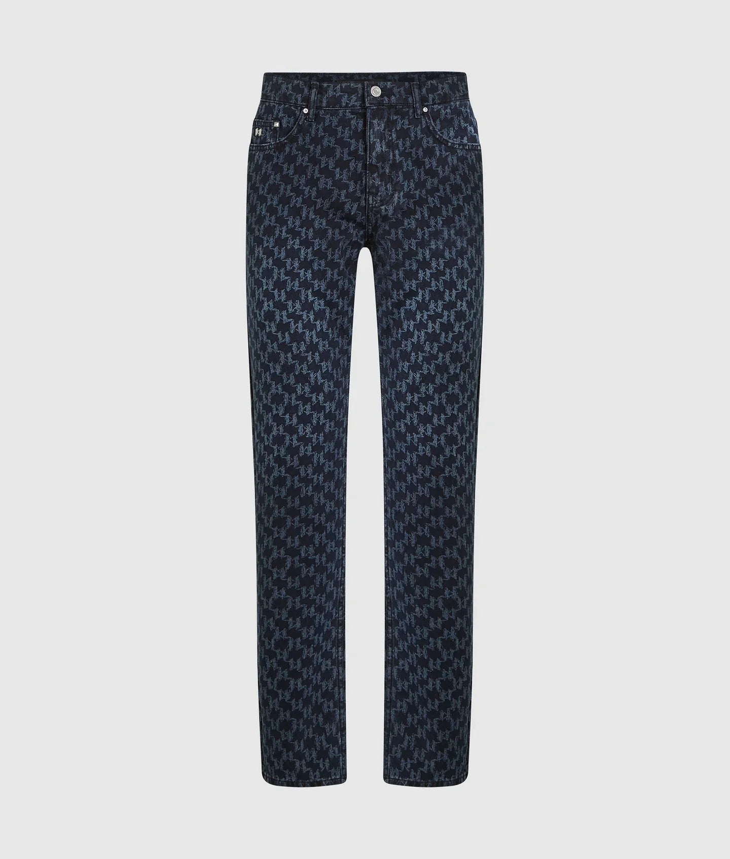 These standout jeans showcase an all-over KL Monogram print with a distressed, corroded look, adding a rebellious edge. A KARL LAGERFELD patch accents the back waistband for subtle branding.