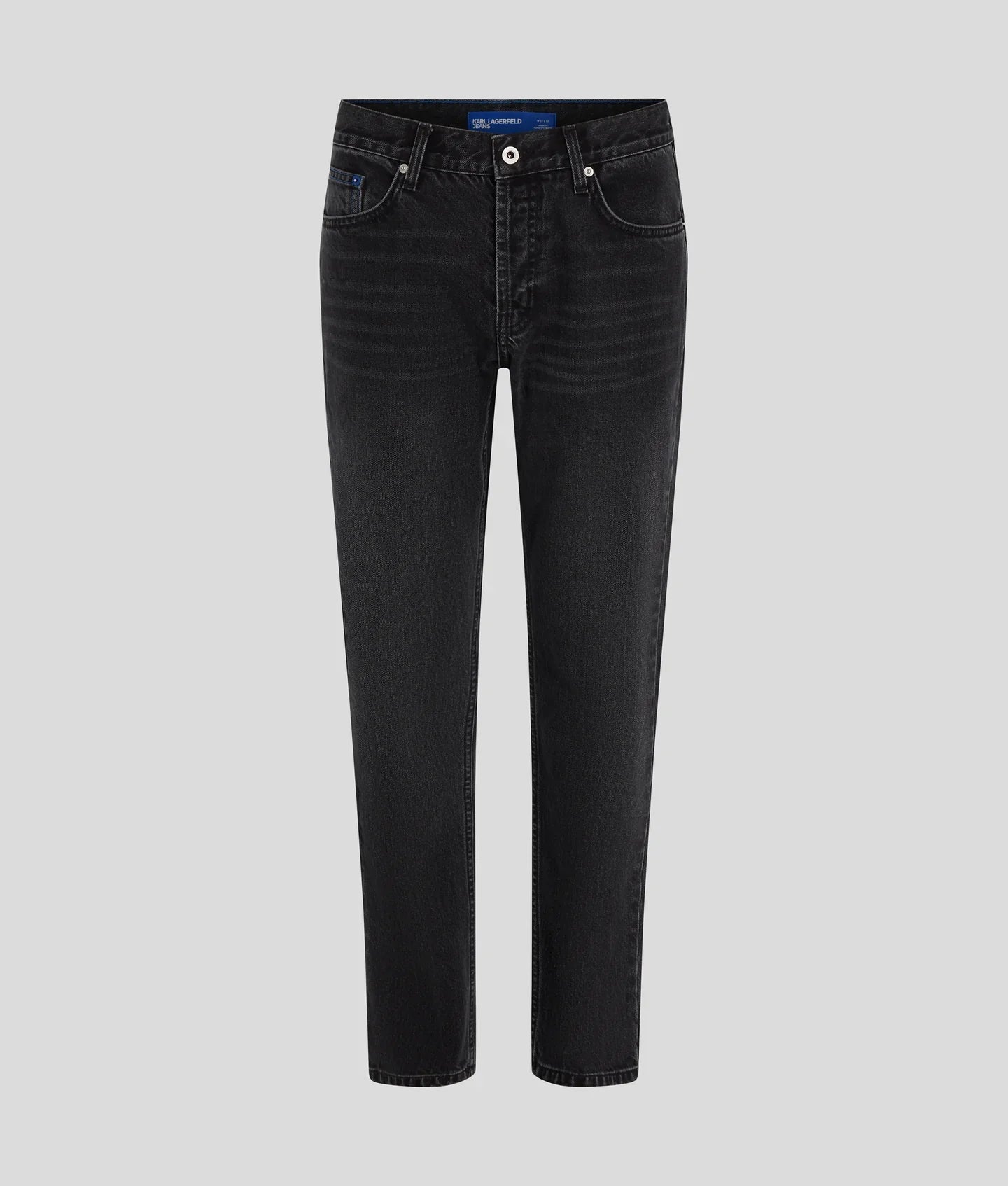Navigate casual-cool styling with ease in these tapered washed jeans, with a branded button closure. These confident pants are anchored by KARL LAGERFELD JEANS' signature leather patch and a distinct K-embroidery accent on the back pocket.