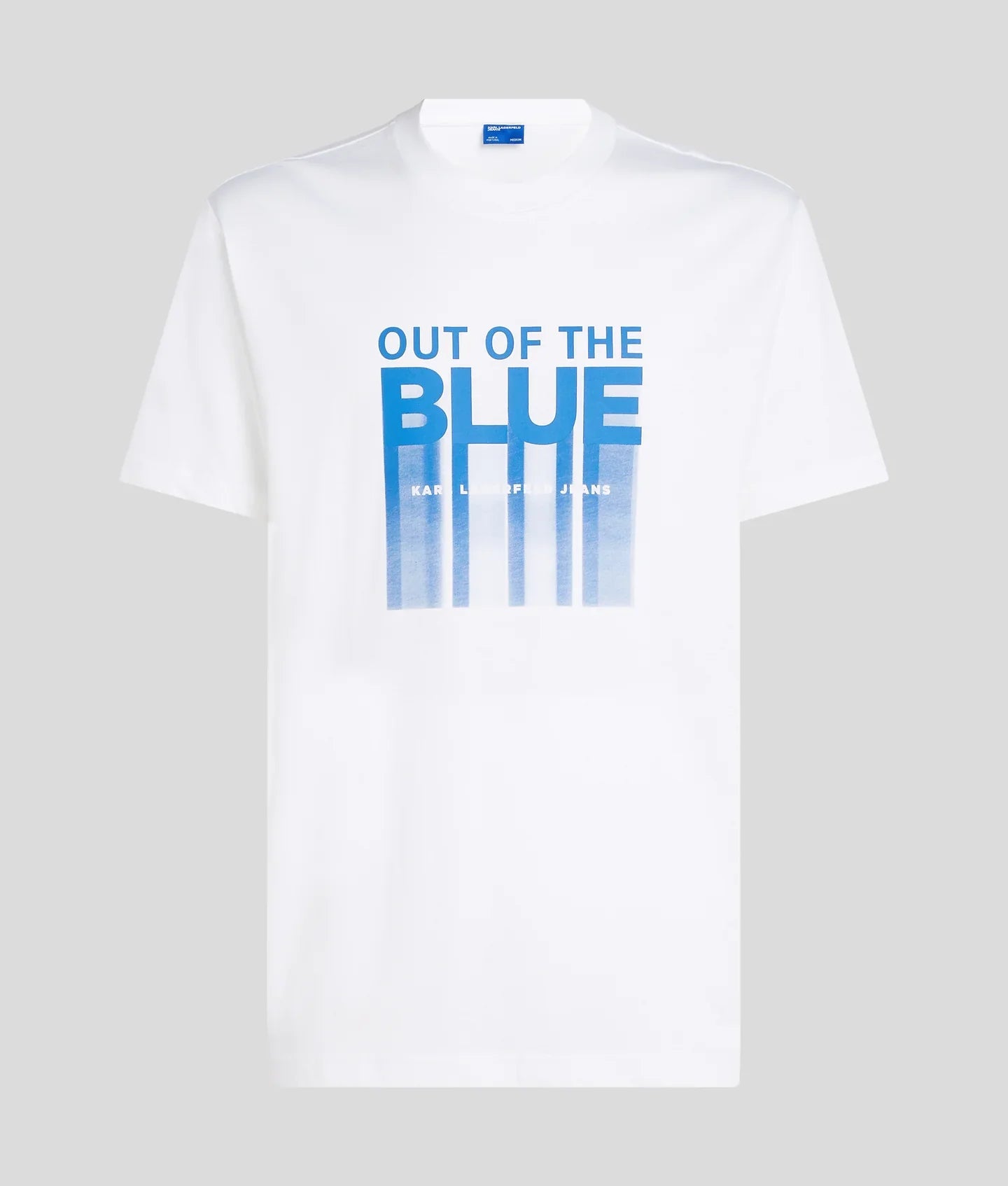 This standout T-shirt showcases a bold 'Out of the blue' design at the chest. Featuring a classic crew neck and short sleeves, complemented by a KARL LAGERFELD JEANS woven label at the back hem, it blends a timeless silhouette with unique design.