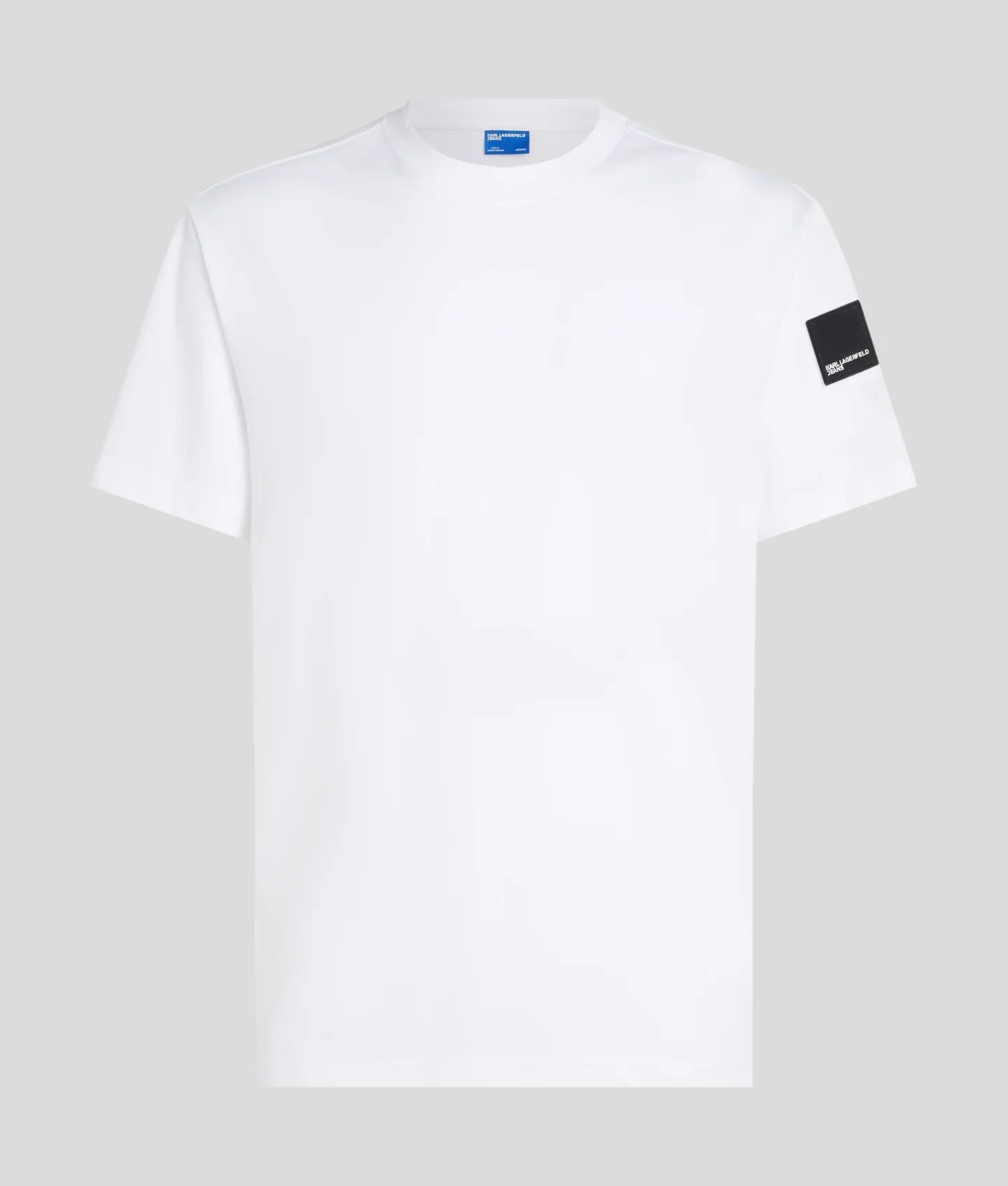 A versatile T-shirt perfect for laidback looks. The classic crew neck and short sleeves ensure comfort, while the distinctive KARL LAGERFELD JEANS silicone patch on the left sleeve adds a unique touch.