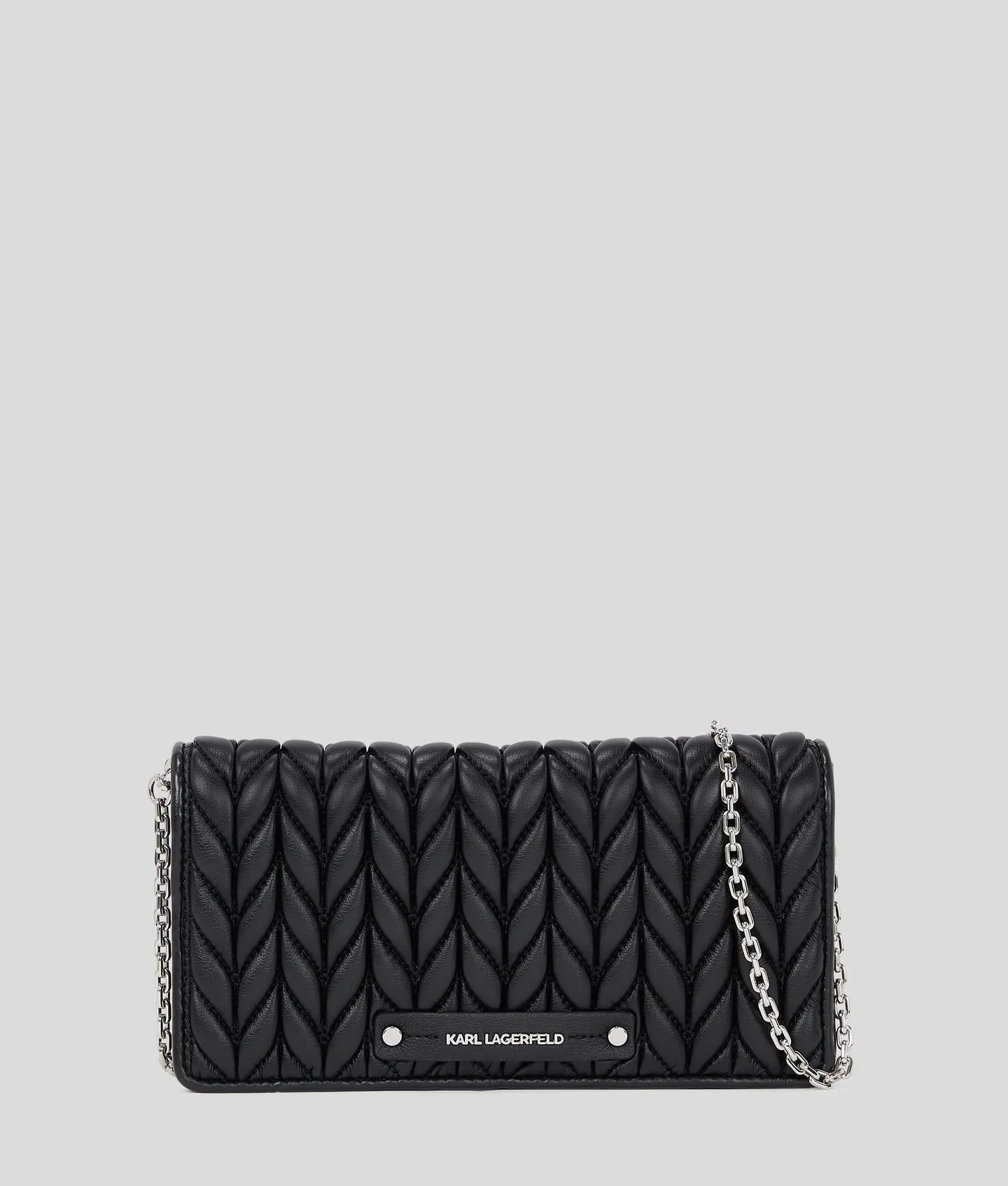 Sleek and stylish, this crossbody wallet, inspired by Karl Lagerfeld's travel pillow, showcases a slim silhouette crafted from innovative technical leather. A chic silver-toned chain strap ensures effortless wear, while a discreet KARL LAGERFELD logo tab adds a touch of flair.
