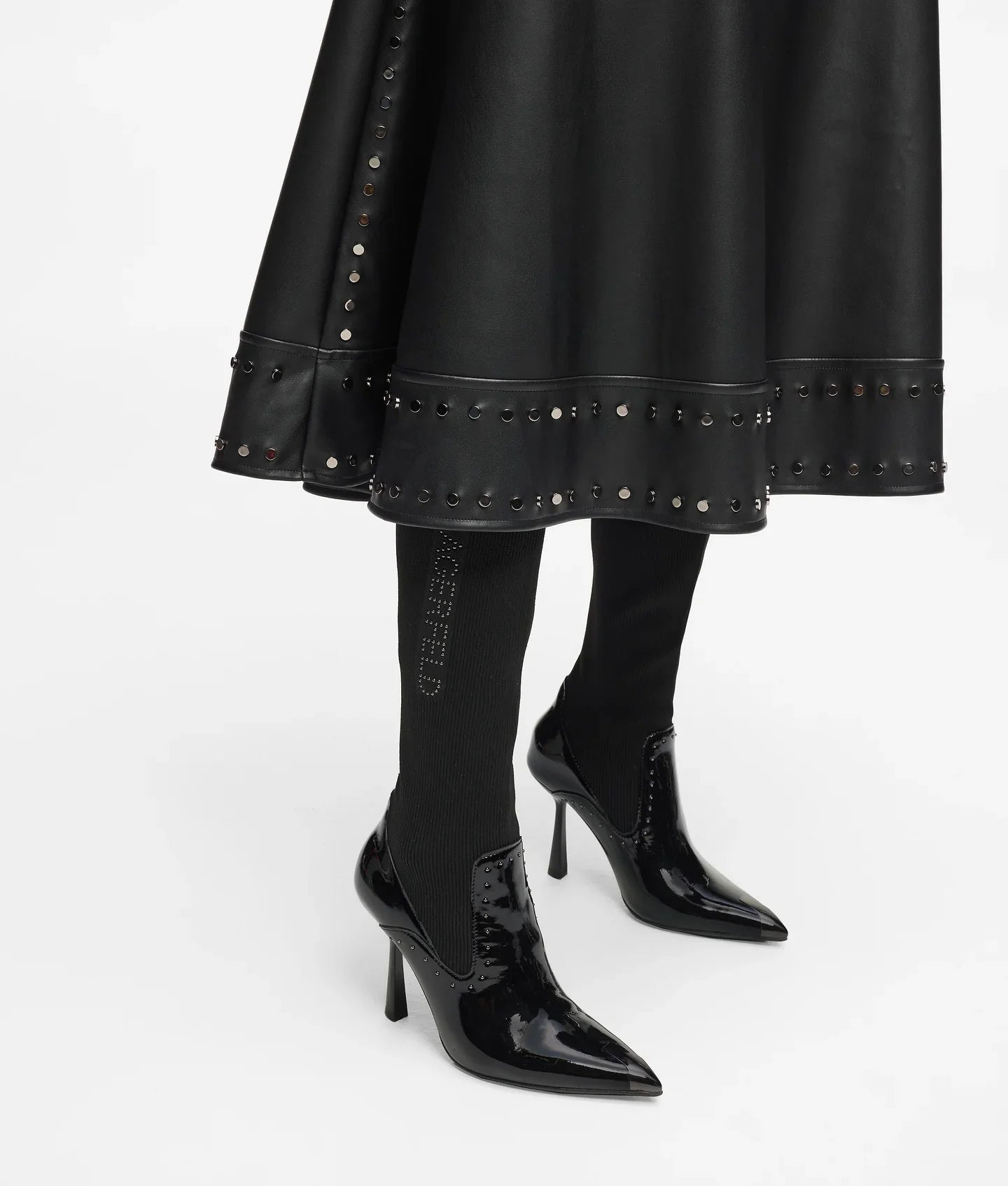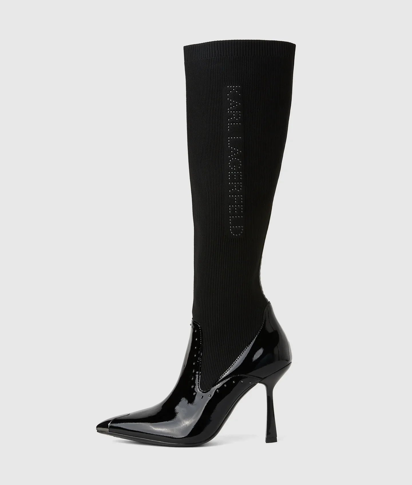 Blending sophistication and edge, these tall boots feature rock-chic stud embellishments and a contemporary mixture of leather and knit for a streamlined fit. A pointed toe and stiletto heel add to the bold look.